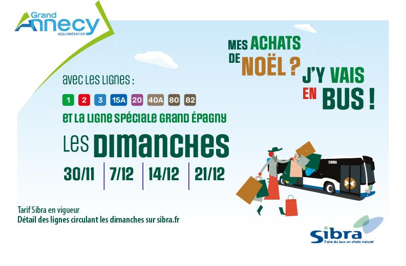 À l’approche des fêtes de fin d’année, le réseau de bus SIBRA de l'Agglomération du Grand Annecy s’adapte pour faciliter vos déplacements, sans embouteillages ni difficultés de stationnement. Nous vous accompagnons pour vos achats de Noël avec les lignes Rythmo 1, 2 & 3, les lignes 15A, 20, 40A, 80, 82 et la ligne spéciale à destination du Grand Epagny, disponibles tous les dimanches du 30 novembre au 21 décembre 2025 au départ de la Gare d’Annecy.